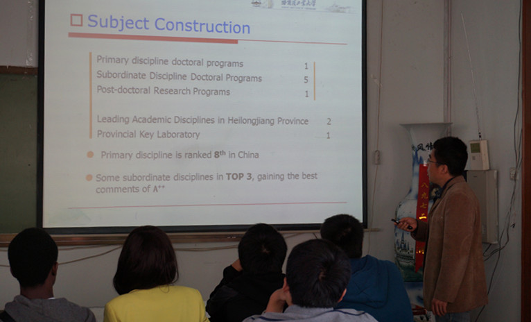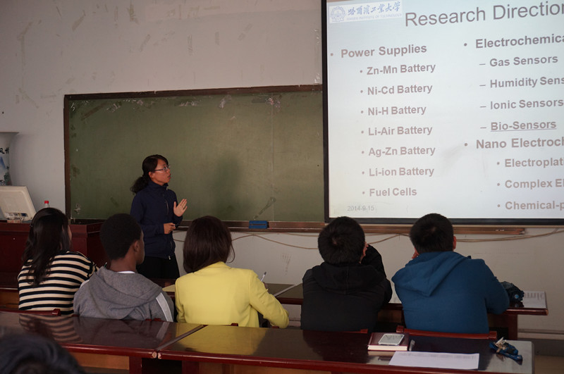 化工学院本科全英文授课项目是我校首批开展本科全英文授课项目的两个学院之一。2014年招收新生7人,分别来自印尼、英国、韩国、津巴布韦、塞内加尔等6个国家。 为了使新入学的留学生对学院、专业和哈工大的学生守则等有初步的了解,我院于2014年9月15日下午1:30在理学楼901房间举行了本科全英文授课项目14级新生专业介绍会。我院王志江老师首先给留学生们介绍了哈工大和化工学院的简况。随后,高分子科学与工程系的副系主任龙军副教授和应用化学系的霍华副教授分别给留学生们介绍了高分子材料与工程专业和化学工程与工艺(电化学)专业的情况,从专业特点、培养目标,到师资力量、科研实力、就业情景等方面做了详细介绍。老师们生动的讲解,极大地调动了同学们的兴趣,现场气氛反映热烈。最后,我院本科教学秘书刘丹青老师就哈工大学生守则在注册、选课、出勤、补考、重修等方面内容给留学生们做了简要的介绍。 老师的详细介绍使留学生们获益匪浅。通过此次介绍会,留学生们对学院和专业情况有所了解,有助于留学生们进一步明确自己未来的学习方向和今后的发展方向,以最饱满最自信的心态来迎接学习。
