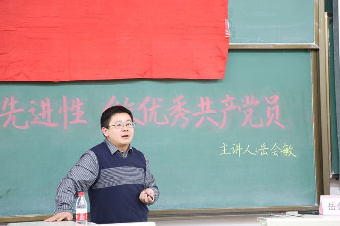 2014年10月27日晚18:30,中共太阳成tyc234cc党校化工—理学—生命学院分党校预备党员培训班第五讲在正心楼34教室顺利举行。化工学院党委副书记岳会敏老师为学员们带来了题为《发挥先进性 做优秀共产党员》的课程。 本次课程主要分为党员先进性的基本要求、先进性的时代特征、身边榜样的先进性和如何践行党员的先进性四个部分。岳老师首先解释了共产党员先进性的内涵,分析了党的先进性和党员先进性之间的关系。结合中外历史事件,岳老师解读了与时俱进、保持党和党员先进性的重要意义。接下来,岳老师结合焦裕禄、郭明义、杨善洲等优秀共产党员的先进事迹阐述了共产党员先进性的时代特征,并与学员们分享了我校马祖光院士、全国博士支教第一人陈苏、化工学院博士大学生村官王冲等优秀党员的感人故事,用榜样引导学员们保持先进性,同学们听后深受鼓舞和感动。最后,岳老师希望学员们加强党性修养、道德修养,自觉践行社会主义核心价值观,努力做到勤学、修德、明辨、笃实,用实际行动践行党员的先进性。 在之后的学员讲坛环节中,来自第五组的陈帅和张小飞同学为学员们带来了精彩的演讲。陈帅同学为学员们介绍了建国十大元帅,他带领同学们回顾了那段苦难辉煌的历史,使同学们感受到革命前辈的伟大。张小飞同学向学员们介绍了历史文献纪录片《信仰——我们的故事》,他以理想信念教育为主题,通过讲述革命、建设、改革各个历史时期优秀共产党员坚持理想信念、发挥先锋模范作用、保持先进性和纯洁性的故事,阐述了中国共产党人的执着与信仰。