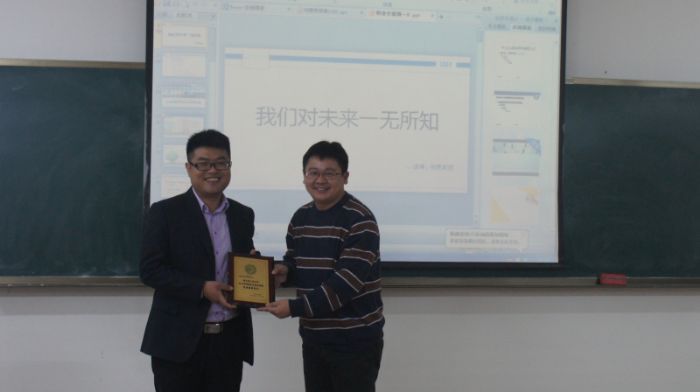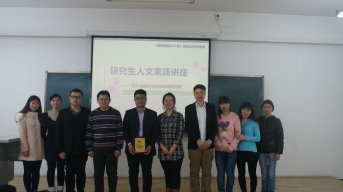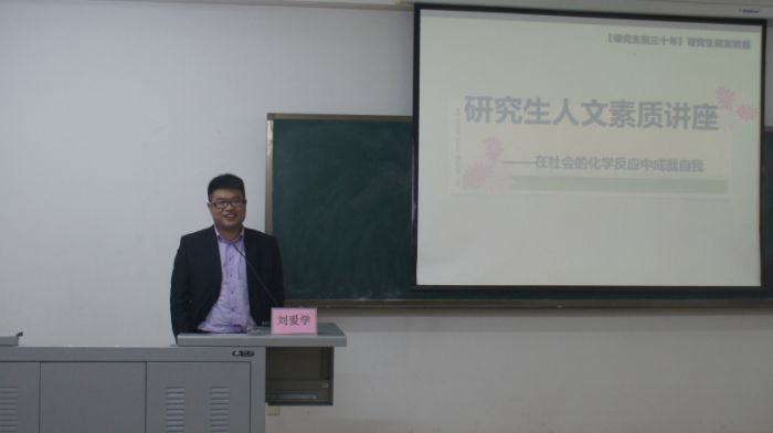 11月25日下午16:00在新活动中心432,化工学院研究生校友、中国南车株洲时代新材料科技有限公司工塑产品事业部副总工程师兼摩擦材料事业部总经理---刘爱学,与同学们分享了他的成长经历与感悟。 研究生阶段是每位学子提升自我的黄金时期,同时也是不少学子对人生目标的迷茫时期。“虽然我们对未来一无所知,但每个人都渴望成功”刘教授开场的第一句话便说中了大家的心声。随后刘教授运用形象的化学比喻分别从化学的启示、定位——寻找个人可能的最大交换价值、积累能量——提高交换价值途径、翻越能垒——飞轮效能四个方面为大家做了系统而详细的讲解,此次讲解不仅使同学们意识到树立目标的重要性,更为大家从了解自己到找到自己的核心竞争力,再到树立合理目标、步步实现目标提供了一套切实可行的方案。 而后,刘教授结合自身十年来的学习和工作经历,从如何选择科研方向、企业需要什么样的人才等方面给予了大家诸多指导。作为过来人,他再三告诫大家不管在学生阶段还是以后到工作岗位,要想成为优秀的人,就要始终记得破万卷书,始终记得谋定而后动,始终记得不断提高自身的核心竞争力!随后刘教授以“牢记使命,提升价值,实现利益最大化”结束了精彩激情的演讲。演讲结束后刘教授又耐心细致的解答了大家的疑惑。 最后,由化工学院党委副书记岳会敏老师为刘爱学教授颁发了纪念牌并合影留念,讲座在热烈的掌声中落下帷幕。