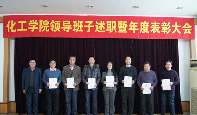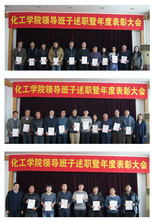 12月30日,化工学院2014年度领导班子述职暨年度表彰大会在理学楼308召开,党委组织部刘丽美老师、化工学院全体教职工参加此次大会。 院长黄玉东代表领导班子做2014年度领导班子述职报告,并对个人工作进行总结。黄院长在领导班子述职报告中,全面总结2014年度学院在人才培养、人才引进、科学研究、学科建设、师资队伍、国际化办学和学生工作等方面取得的成绩,并提出2015年工作思路和重点工作。党委书记岳会敏对学院党建工作、人事工作等进行总结,着重强调人才培养与师资队伍建设的重要性。副院长尹鸽平、杨春晖和孟令辉分别就分管工作进行全面总结。 与会教职工从德、能、绩、勤、廉等方面对学院领导班子成员进行民主测评,并进行现场无记名投票。 述职大会结束后,学院对2014年度在科研、教学、人才培养、太阳集团等方面表现突出的先进集体和个人进行表彰,院领导为获奖教职工进行颁奖。