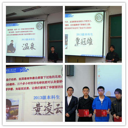 3月20日上午,以“成长,要努力一点”为主题的化工学院2013级本科生年级大会在致知楼12教室成功召开。辅导员李宏涛和2013级全体本科生出席了此次年级大会,会议由1314101班进行策划和组织。 李老师首先对同学们上个学期初年级大会上所反映问题的解决落实情况予以通报,然后以“成长,要努力一点”为主题,围绕努力、收获、遗憾、希望四个关键词,结合同学们上一学期取得的成绩和存在的问题进行了演讲与分享。 学院党员学风建设督导队2012级本科生支部郭城同学,针对大二下学期各门课程的注意事项进行了细致讲解,为2013级的学风建设提供了切实有效的帮助。 在通过PPT对各小班上学期的精彩瞬间进行回顾之后,大会还表彰了黄凌云、覃冠雄和温泉三位年级“成长之星”,李老师亲自撰写了颁奖词并为获奖同学颁奖。三位同学在惊喜之余,也分别与大家分享了他们的成长故事,赢得了热烈的掌声。 辅导员李宏涛还对年级工作进行了布置,并对学风考风、评奖评优等进行了重点强调。 本次年级大会阶段性的总结了同学们的成长和收获,也相信2013级的同学们能在努力中成长,在成长中收获! (一)全体起立,奏唱校歌 (二)“成长 要努力一点”主题演讲与分享 (三)党员学风建设督导队2012级本科生支部郭城进行学习指导