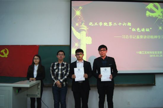 2015年3月26日18:30,以“习总书记系列重要讲话精神学习”为主题的化工学院第二十六期党员红色讲坛在正心楼105教室成功举行,本期讲坛由2011级化学工艺本科生支部承办,学生党建负责人李宏涛、各学生党支部支部书记、支部委员,以及党员、积极分子参加了本期讲坛。 在本期红色讲坛中,雷斌、杨东辉等五位预备党员进行了主题演讲。演讲者结合时事热点 和自身的思考,分别从精神文明建设、生态文明建设、国际关系和我国外交战略等方面,精彩地阐述了对习总书记系列重要讲话精神的思考和感悟。经过评委评审和在场观众投票,来自14S2503支部的丁成获得了本期第一名,2013级本科生支部付昊获得最高人气奖。李老师在颁奖后进行了总结,他结合“人民有信仰,国家有力量”和“党要管党,从严治党”对各支部成员提出了具体的要求。 化工学院红色讲坛是提高化工学院党员党性修养的重要平台之一。讲坛结合重大时事新闻和国内热点,以主题演讲的形式,提高学生党员的理论水平和对时政的了解,提升学生党员关注时事的意识,切实发挥党员先锋模范作用