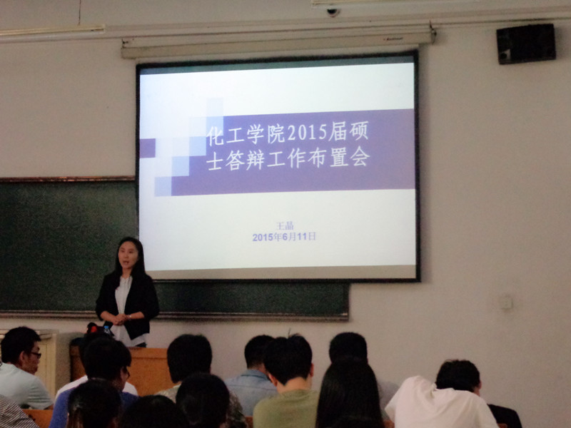 在2015届硕士研究生毕业之际,为了让同学们顺利地完成毕业答辩、离校各项事宜,化工学院于2015年6月11日在诚意A103召开了2015届硕士答辩布置会。研究生教学秘书王晶老师、研究生协理员王玉楠老师及全体2015届硕士研究生参加了此次会议。王晶老师就硕士毕业生答辩前后注意事项、学位档案的填写方法、学位认证等相关问题给同学们做以详细说明,并制作了重要事件的时间安排表,为同学们带来了极大的便利。王玉楠老师就毕业派遣、毕业登记表填写、毕业生教育活动以及毕业安全问题为大家进行详细地介绍,希望大家为自己的研究生生活画上一个圆满的句号。