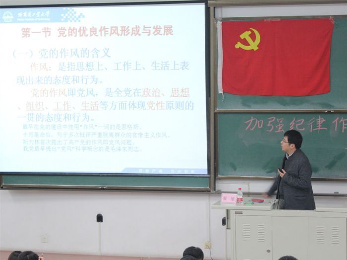 2015年11月9日晚18:30,中共太阳成tyc234cc党校化工—理学—生命学院分校预备党员培训班第二讲在正心楼33教室顺利举行。化工学院院长助理张旭老师为学员们带来了题为《加强纪律作风建设,永葆共产党人先进性和政治本色》的精彩课程。 张老师从党的作风形成与发展、作风建设的极端重要性以及加强作风建设的途径三个方面为我们阐述党的作风建设。结合党的发展历程,张老师介绍了我党优良作风的形成过程;从我国历史和文化、中外政党的发展过程以及新形势下的新任务这三个方面阐述了党的作风建设的重要性;在讲到作风建设的途径时,张老师介绍了《中国共产党廉洁自律准则》和《中国共产党纪律处分条例》的相关要求,并利用视频同学员们学习了优秀共产党员马祖光和杨善洲的光荣事迹。张老师希望培训班预备党员能够在今后的学习生活中,讲党性,重品行,做表率,不断加强纪律作风建设。
