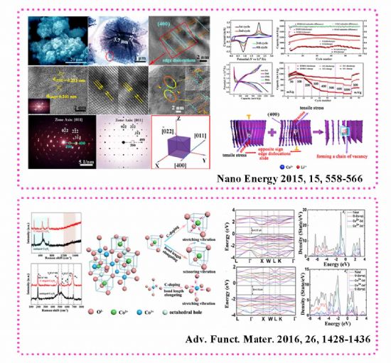 近期,化学与化工学院材料化学系陈刚教授的研究团队(能量转换材料化学研究团队)在锂离子电池负极材料研究方面取得新进展。研究成果分别发表在能源及材料化学领域的著名期刊《纳米能源》(Nano Energy,2015影响因子10.325)及《先进功能材料》(Adv. Funct. Mater.,2015影响因子11.805)上,两篇论文的第一作者均为2013级博士生闫春爽。其中,《刃型位错表面修饰:一种全新有效的实现高锂电性能的策略》(Edge dislocation surface modification: A new and efficient strategy for realizing outstanding lithium storage performance)的研究论文发表于《纳米能源》。该论文提出了一种全新的基于刃型位错修饰晶面的策略,用以有效地缓解充放电过程中体积膨胀。依照该策略首次合成出了带有敞开的锂离子通道、大量反应活性位点的氧化钴负极材料,使其在循环稳定性和倍率性能上有了新的突破;此外,《基于模板法设计合成碳掺杂的Co3O4空心纳米纤维锂离子电池负极材料》(Template-based engineering of carbon-doped Co3O4 hollow nanofibers as anode materials for lithium-ion batteries)发表于《先进功能材料》。该论文采用非金属碳掺杂的方式实现了材料电导率的本征改变,使其电化学性能显著提升。并通过理论计算与实验相结合,很好的阐述了该方式的可行性,为改善氧化物负极材料的电化学性能及其实用化提供了新思路。