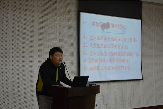 保卫处宋彬老师结合近期国内有关高校、科研院所化学化工实验室发生的安全事故,为全院教职工做了化学类实验室安全知识培训。他分别从对实验员服装要求、饮食要求、药品领用与存储、实验室安全操作规程、实验室“三废”处理及实验室安全防护与急救等六个方面进行了详细的讲解,希望各位老师提高安全意识,增强抓安全的责任感。