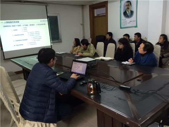 专题党课前,岳会敏传达了校党委书记王树权在学校“两学一做”学习教育工作推进会上的讲话精神,希望大家切实把从严治党要求落实到每名党员,克服简单学一下、发一本书看看了事的应付思想,按照党支部学习教育计划和“党支部书记抓党建工作立项”和“梦想•担当党支部活动立项”内容,严格按进度、按要求认真抓好“两学一做”学习教育。随后,岳会敏以《扎实推进人事制度改革,建设世界一流学科》为题,重点介绍了当前学校人事制度改革的进展、人事制度改革的重点任务、学院“十三五”发展建设规划和学院人事制度改革的工作安排。