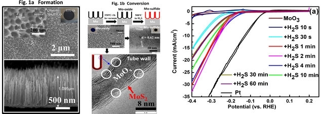 钼基化合物尤其是钼基氧化物和硫化物是在电化学和光电化学等应用领域极具潜力的功能材料。一维有序结构的纳米材料在电子传输性能、量子限域效应、比表面积和结构稳定性等方面具有独特优势。杨敏与德国爱尔朗根-纽伦堡大学合作,以电化学阳极氧化法首次合成了一维有序的MoO3纳米管阵列,通过H2S下的热处理构筑了一维有序的MoOx/MoS2核壳结构。这种核壳结构的纳米管阵列具有协同效应,电催化析氢和离子嵌入性能出色。本研究成果对电化学和光电化学等领域的基础和应用研究将起到积极的推进作用。