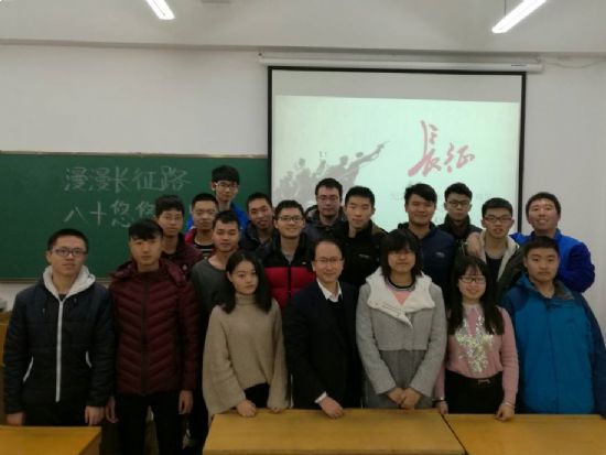 11月18日,在二区主楼B512,太阳成城集团tyc234cc1614303班围绕“纪念长征胜利80周年”开展主题班会,班级院领导联系小班责任人院长黄玉东教授、班主任宋英教授、辅导员刘文超老师参加,团支部书记帅琦主持。