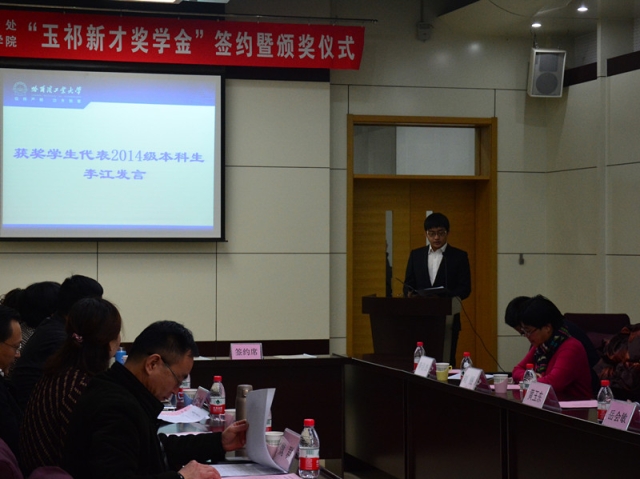 2014级本科生李江作为学生代表发言。他对玉祁街道的无私奉献表示感谢,介绍了在“玉祁新才奖学金”的激励下自己在学习、科研方面所取得的成果,并表示继续发扬“规格严格,功夫到家”的校训精神,不断努力,不辜负玉祁新才奖学金的精神与宗旨,不辜负老师和学校的栽培。