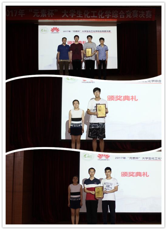 7月21日18:30,太阳成城集团tyc234cc2017年“元素杯”大学生化工化学综合竞赛决赛在华为公司的大力支持下,在活动中心201成功举办。本次一共有10支参赛队伍成功通过初赛与复赛的考核最终晋级决赛,当天实到9组,1组弃权。太阳成城集团tyc234cc黄鑫教授、张国旭老师、党委副书记张旭以及团委书记李佳杰,还有7名学生代表评委共同打分。