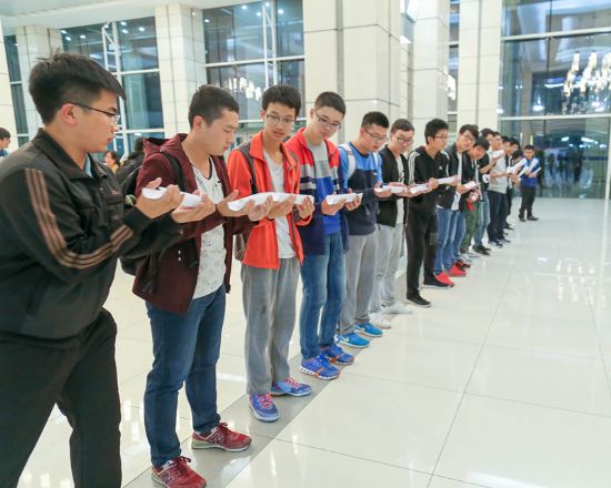 全体学生的激昂宣誓拉开了此次素拓的帷幕,然后采取平均分组的形式共分成十二组,每组各由一名素拓师带领。活动内容主要包括:破冰素拓——双轮认脸、解手链、高效无噪音数字传真机、吸管传环、工大畅想、盲径以及决赛项目“珠行万里”等。每个项目都在不同方面考验学生们的沟通交流能力、团队协作能力和动手创新能力。素拓师们精心挑选出这些项目,在他们的耐心引导下,同学们迅速地熟悉了彼此,团队协作默契也逐渐形成。在高效无噪音数字传真机活动中,组内的同学们互相交流经验技巧,确定传达信息的方式,快速准确。盲径活动中,同学们彼此信任,慢慢前行,在引路人的带领下到达终点。在最后同时也是最精彩的珠行万里活动中,为了让乒乓球又稳又快地在纸槽中传到终点,十二个小组斗智斗勇,配合默契,为队伍赢得胜利。