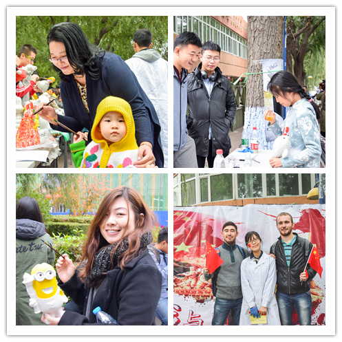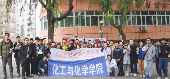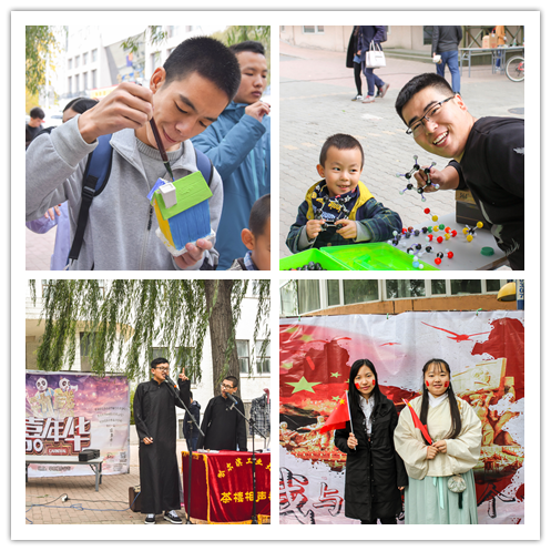 我和国旗合个影展台处,同学们有的脸上贴着小国旗、有的手举国旗,摆出积极、向上富有创意的姿势合影,还有许多留学生也参与其中;在最受欢迎的色彩地带,大家使用化学试剂选配出不同颜色后,在石膏上用颜料进行创意绘画,创作自己喜欢的作品并合影留念;闻看试剂,同学们在工作人员的指导下闻不同气味、看不同颜色的化学试剂,并与现场提供的化学物质名称进行匹配;趣味实验,同学们在工作人员的指导下根据实验原理利用现场化学药品自行完成趣味小实验;球棍模型,同学们利用一定数量的球、棍搭建化学分子模型,或者可爱的小动物,尽情发挥想象力;穿越雷区,学生们两两组队进行挑战,一名挑战者戴眼罩,另一名挑战者充当指挥官,蒙眼者在指挥官的指导下排除“地雷”按照规定路径到达目的地,期间不少人踩中“地雷”,考验了同学们的默契度与身体平衡能力;套环猜迷,大家利用五次套环的机会,投取套瓶,回答从套瓶中抽取的有关化学物质或仪器的字谜;益智类小游戏,或是飞镖打靶、或是竹简投壶,趣味甚多。本次活动还有原声吉他社、茶楼相声社的即兴友情助演,同学们在享受活动乐趣的同时,更受到音乐和相声的熏陶与感染,在笑声与音乐声中嘉年华活动持续近3小时之久。
