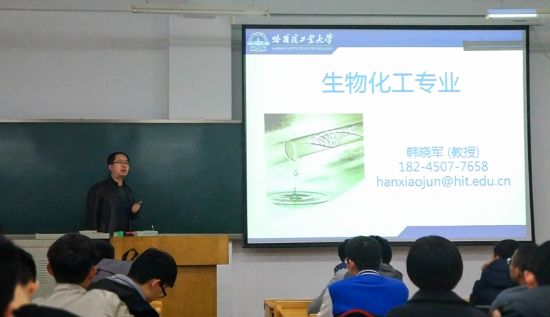 在本次课程中韩晓军教授分别从师资队伍、学生培养、国际化交流、毕业生流向和专业概论这五个方面来介绍生物化工专业。在第一部分中,他给同学们介绍了教育部新世纪优秀人才支持计划,表现出生物化工专业近几年飞速发展的极好趋势,同时也介绍了大批优秀的教授讲师,展现出该专业优秀的师资队伍。紧接着,在第二部分中,教授提出了生物化工专业培养人才的宗旨,即科研能力和敬业精神,以及其研究生团队的口号:“毋固、毋我、毋陈、毋怠”,鼓励同学们发扬严谨求实、勇于创新的精神。在后面的国际化交流、毕业生流向部分中,教授通过美丽而迷人的英国、美国和瑞士等国家的知名高校图片,打开了同学们通向国际化的视野之门。最后,韩晓军教授通过生物化工在医药、食品、石油、生命科学和农业中的应用实例和本次大一年度项目课题的详细介绍,让同学们更加形象具体地了解了该专业,极大地激发了同学们对该专业的兴趣。