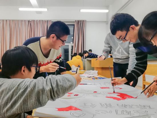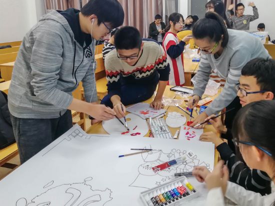 在这次活动中,我班同学团结配合,相互协调,表现出了极大的热情。辅导员曲帝吉为我们准备了图纸和绘画所用的各种其他器材。王双同学为我们提前画好了线稿,在10月25日晚上,我们通力合作,为图画上色。刘宸希同学为大家分配了任务,李睿豪、朱畅等同学认真地调颜料和染色。在天蓝色的颜料不足时,辅导员用其他颜色神奇地为我们调出了蓝色。其间,我们共同讨论每一部分的着色细节,出谋划策,最后,高博同学为图画在右下角补上了一些文字,我们的团报就这样圆满完成。