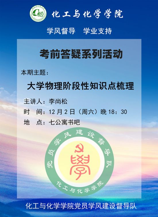 学院党员学风建设督导队将于12月2日(周六)晚18:30开展大学物理阶段性知识点梳理。