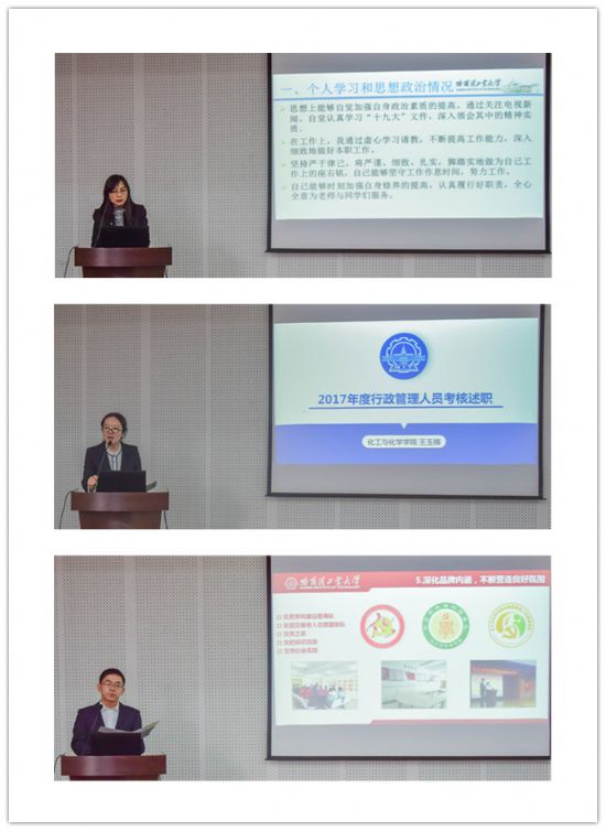 岳会敏在讲话中指出,学院对机关行政管理人员进行述职考核,是为了在“双一流”建设中加强管理队伍的建设,进一步增强机关人员的服务意识,进一步提高管理服务能力和水平。机关管理人员通过述职,能够对照其他同事的工作在自己身上找差距,促进相互学习交流、取长补短。各单位教职工和学生代表作为服务对象为管理人员考核打分,能够进一步增强对学院整体管理工作的了解,加强对学院机关工作的监督。他希望大家本着客观、公正、负责的态度,对自己熟悉了解的管理人员进行测评打分。