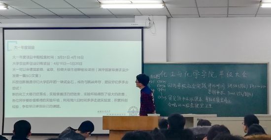 大会开始前,曲帝吉组织各班班长分发2018年春季学期课程表,并安排学生张贴在寝室的墙上,提醒同学们上课时间。年级大会上,曲帝吉首先结合2017年秋季学期学习成绩进行了总结,指出不足之处,对新学期要学习的科目进行充分说明并详细介绍了相应的学习方法。为提高学生听课效率,从本学期开始在部分课堂尝试开展“无手机课堂”活动。接着曲帝吉结合大一年度项目、大学生创新创业训练项目、基础学部优秀优良学风班评比等内容,强调了科技创新、班风建设的重要性,鼓励班级干部积极组织开展班级活动,班级学生积极参加科技创新活动。