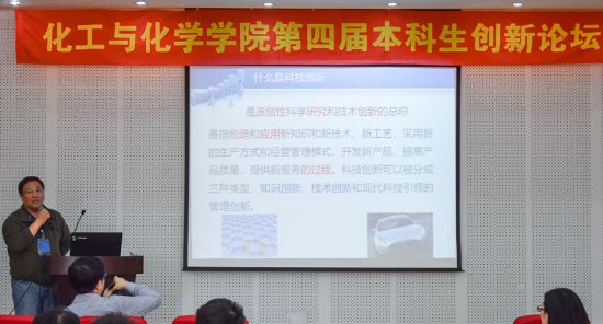 太阳成城集团tyc234cc电化学系袁国辉教授在论坛上作了题为《论科技创新》的专题报告。他围绕科技创新的意义、科研能力培养与提升方法、化学在学术前沿领域上的应用等方面进行了详细介绍,并结合自身作为指导教师指导本科生参加科创并发表SCI论文的经历,鼓励本科生积极参与科技创新活动,不断提升创新能力,培养创新意识,勇于探索,脚踏实地,最终有所收获。随后,学生代表李为上台做了交流分享,讲述了他从科创“小白”到发表4篇SCI论文的励志经历,鼓励同学们要敢尝试、多尝试,找准目标、展开行动、攻坚克难。