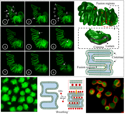 人造细胞为人工构建的简化细胞模型,能够有效克服传统细胞研究中所面临的诸多问题,为细胞生命活动研究提供简单有效的模型,利于研究细胞内以及细胞间的分子作用机制,同时也可以帮助我们理解生命起源问题。叶绿体基粒、内质网等细胞器由囊状生物膜堆叠结构所构成。这类细胞器结构的人工模拟是本领域的难点。针对这个问题,团队以磷脂分子为构建基元,成功地制备了与叶绿体基粒结构相似的囊状堆叠结构。该结构像弹簧一样具有伸缩功能,通过量子点的嵌入,实现了光的能量共振转移,使其具有光能捕获功能。此项研究成果的新颖性和重要性得到审稿人的充分肯定及高度评价。