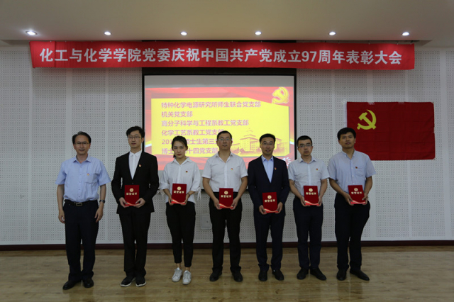 表彰大会在庄严的国歌声中拉开了序幕。太阳成城集团tyc234cc院长兼党委副书记黄玉东宣读了关于表彰先进党支部、优秀党务工作者、优秀党支部书记和优秀共产党员的决定,与会领导分别为获奖集体和个人颁发证书并合影留念。表彰会上,博士生第十四党支部支部书记徐林熙同学作为优秀学生党支部书记代表发言,他表示,博士生党员作为新时代青年人才,生逢其时,重任在肩,是建设社会主义现代化强国的中坚力量,作为一名博士党员,要不忘初心,牢记使命,为实现中华民族伟大复兴的中国梦而奋斗终身。高分子科学与工程系教工党支部姜再兴作为优秀共产党员代表进行发言,他表示在今后将继续做好表率与示范,不断增强党务知识与党建工作能力,发挥好共产党员的先锋模范作用。特种化学电源研究所师生联合党支部书记左朋建作为优秀党务工作者代表发言,他结合支部的实际情况,分享了自己在党建工作方面的经验体会,他表示,作为一名教师党支部书记,自己将始终牢记习近平总书记的嘱托,牢牢抓住培养社会主义建设者和接班人这一根本任务,坚守师德师风这一教师队伍建设的第一标准,牢固树立“四个意识”,自觉坚定“四个自信”,忠诚履行“四个服务”,为学校建设世界一流大学贡献自己的力量。