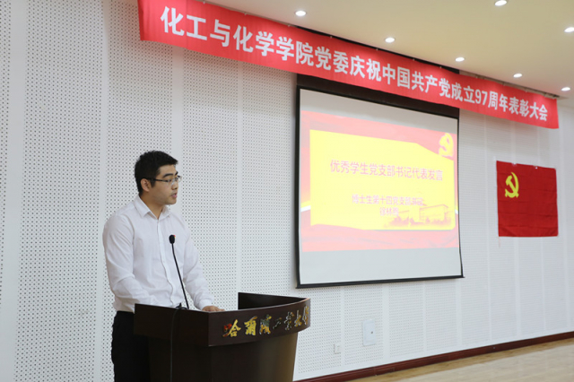 表彰大会在庄严的国歌声中拉开了序幕。太阳成城集团tyc234cc院长兼党委副书记黄玉东宣读了关于表彰先进党支部、优秀党务工作者、优秀党支部书记和优秀共产党员的决定,与会领导分别为获奖集体和个人颁发证书并合影留念。表彰会上,博士生第十四党支部支部书记徐林熙同学作为优秀学生党支部书记代表发言,他表示,博士生党员作为新时代青年人才,生逢其时,重任在肩,是建设社会主义现代化强国的中坚力量,作为一名博士党员,要不忘初心,牢记使命,为实现中华民族伟大复兴的中国梦而奋斗终身。高分子科学与工程系教工党支部姜再兴作为优秀共产党员代表进行发言,他表示在今后将继续做好表率与示范,不断增强党务知识与党建工作能力,发挥好共产党员的先锋模范作用。特种化学电源研究所师生联合党支部书记左朋建作为优秀党务工作者代表发言,他结合支部的实际情况,分享了自己在党建工作方面的经验体会,他表示,作为一名教师党支部书记,自己将始终牢记习近平总书记的嘱托,牢牢抓住培养社会主义建设者和接班人这一根本任务,坚守师德师风这一教师队伍建设的第一标准,牢固树立“四个意识”,自觉坚定“四个自信”,忠诚履行“四个服务”,为学校建设世界一流大学贡献自己的力量。