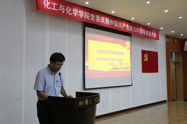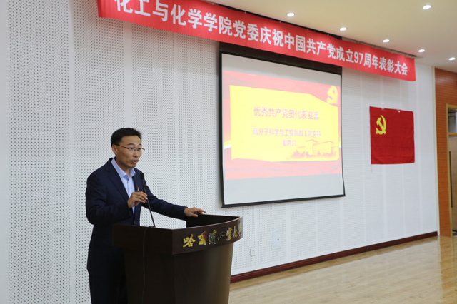 党委书记岳会敏在大会上作了讲话。他首先向优秀党支部书记、优秀党务工作者、先进党支部和优秀共产党员表示热烈的祝贺,并向全院师生党员致以节日的问候。他指出,2017年以来,学院党委深入学习宣传贯彻习近平新时代中国特色社会主义思想和党的十九大精神,认真贯彻落实全国高校思想政治会议精神、学校党委第十二次党代会精神和有关工作部署,扎实推进“两学一做”学习教育常态化制度化,全面深化“党建强基”工程,学院党建和思想政治工作水平不断提升,为建设世界一流化工化学学科提供了坚强保障。他对学院下一步加强改进党建和思想政治工作提出了三点意见和建议,一是要以政治建设为统领,坚持办学正确政治方向,二是要扎实推进“两学一做”学习教育常态化制度化,加强基层党组织建设,三是要坚持立德树人根本任务,大力提升育人水平。岳会敏强调,我们要更加紧密地团结在以习近平同志为核心的党中央周围,不忘初心,牢记使命,砥砺前行,为学校“中国特色、世界一流、哈工大规格”的百年强校建设和世界一流化工化学学科建设贡献力量。