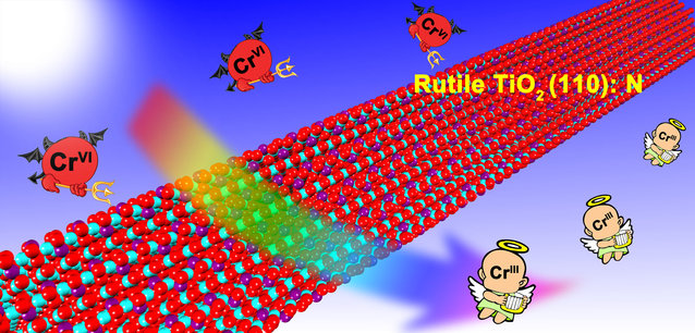 二氧化钛材料以其无毒、稳定、高效的特点一直是高性能材料研究领域的热点。然而在光电化学领域的应用中,二氧化钛较宽的带隙使其对太阳光谱的吸收范围非常有限,限制了这种材料的实际应用。在解决这一问题的过程中,二氧化钛表面无序化被认为是最有效的拓展其对太阳光谱吸收范围的手段之一。但对于需要明确表面吸附点位来启动光电催化过程的化学反应来说,表面无序化显然不利于这类反应的顺利进行。针对该问题,论文采用活性氮原子取代金红石型二氧化钛(110)晶面的三配位氧,从而在材料电子结构中构造出了穿越费米能级的间隙态。这种间隙态极大促进了光生电子向二氧化钛导带的跃迁。论文以光还原六价铬为示例反应,证明了修饰后的二氧化钛表面表现出了极高的反应活性。