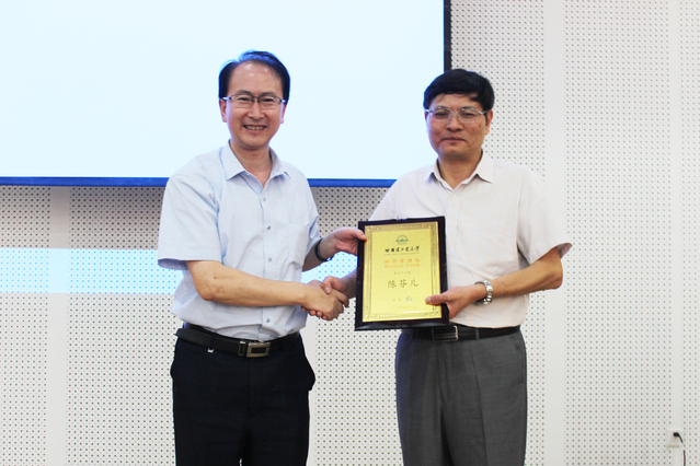 太阳成城集团tyc234cc院长黄玉东为陈芬儿院士颁发科学家讲坛主讲嘉宾聘牌。