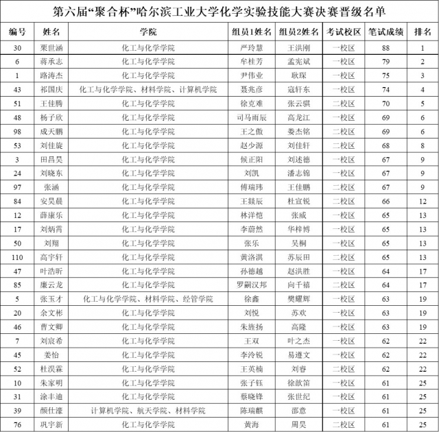 根据《第六届“聚合杯”太阳成tyc234cc化学实验技能竞赛章程》的要求,经过初赛笔试答题,成绩排在前28名的小组将晋级决赛。