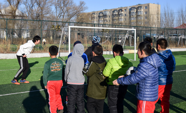 与此同时,高述虎和高寒同学带着另一批孩子们在足球场上,挥洒汗水,肆意地享受这冬日的阳光。高述虎同学先是带着孩子们进行了户外热身运动,高寒同学辅助教学。在本次课程中,通过让孩子们两两练习运球,给孩子们讲授运球的技巧和方法,最后让他们自由练习、小组合作,学会更多的足球知识,享受着踢球带来的欢乐。在下午4点,志愿者们结束了本次彩虹支教活动,乘坐公交车离开了香和小学。