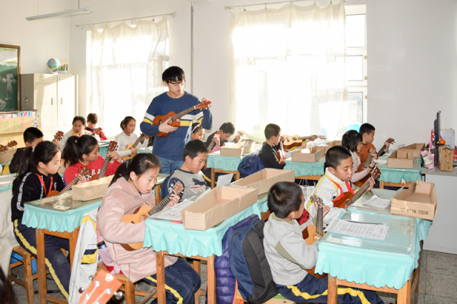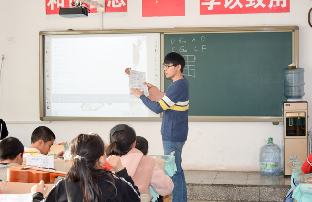 志愿者们在领队同学聂兰蘅、刘越的带领下,在下午1点半左右抵达香和小学。在教导主任的安排下,尤克里里、手语以及足球的“讲师”进入到了各个班级,进行上课前的准备。本次的尤克里里课程是由张彪同学负责的,提前准备好了新曲目《苔》的尤克里里谱和涉及到的相关乐理知识,紧接着上一节课继续进行新曲目的学习。《苔》是一首由清代诗人袁枚作词、贵州支教教师梁俊谱曲的歌曲,在2018年2月,由梁俊带领他的学生在中央电视台综合频道文化节目《经典咏流传》中演唱,感动了无数观众。志愿者讲师张彪将《苔》演示弹奏了一遍,孩子们跟着学习弹奏。最后大家一起合唱了《苔》这首歌,“白日不到处/青春恰自来/苔花如米小/也学牡丹开……”孩子们清澈的声音如淙淙流水,简单纯粹,令人为之动容。