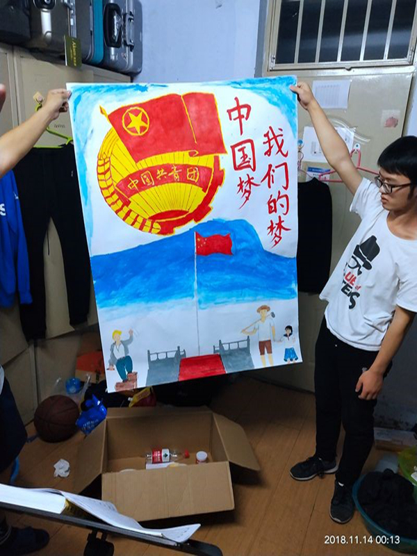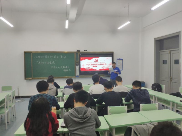 首先,同学们认真观看、学习了习总书记的讲话,回顾了十九大基本内容。随后,入党积极分子王阳明关于学习十九大心得体会进行了演讲,带领大家一起深入学习十九大精神,不忘初心,牢记使命,以习近平新时代中国特色社会主义思想为行动指南,聚焦新目,开启新征程,奋力推进新时代中国特色社会主义事业,实现中华民族伟大复兴,让同学们认识到十九大对我国社会主义事业建设、发展的重要意义。他还与同学们分享了习总书记在十九大讲话中的精彩语录,让同学们感受到了党对社会,人民的关怀,激发了同学们的奉献精神,提高了大家的入党积极性。最后,在团支书的组织下,同学们分工合作,齐心协力,出色的完成了以学习十九大精神为主题的团报绘制工作。