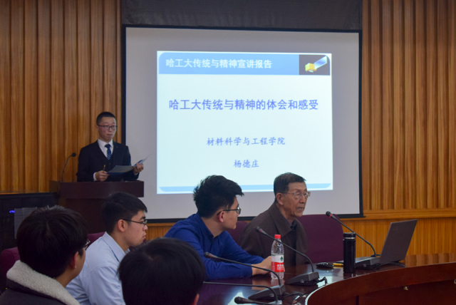 杨德庄教授从哈工大办学传统、校训、哈工大精神等三个方面进行了介绍,对我们进行了勉励并提出了希望和要求。在介绍哈工大办学传统时,杨德庄教授讲到了哈工大有骄人历史、有骄人业绩、又红又专三个特点。随后,从提出原因、内涵理解和如何落实三个方面对校训进行了解读,他强调:“规格严格,不是业务的规格,而是人才培养的规格,要按照德智体美劳全面发展的要求;功夫到家,不仅仅是对于老师的要求,更是对学校、老师和学生等所有人才培养攸关方的要求。”最后,杨德庄教授讲述了以八百壮士为代表的哈工大精神,总结为“爱国、求是、团结、奋进”,并对每一种精神进行了分别的阐释,教导我们要“铭记责任、自强不息”。最后的问答环节中,袁熙呈等多名学员分别结合科研能力培养、个人能力提升等方面向杨德庄教授提出了问题,杨德庄教授对其一一地进行了详细的回答。