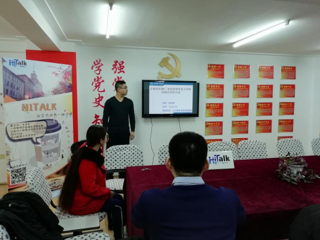 3月15日,此次以“功能材料的制备及其应用”为主题的周末学术汇在十公寓党员工作室开讲。何雄,此次报告的主题是讨论关于Au纳米粒子对光阳极的影响机制。姜旭,此次报告介绍了探讨金属有机框架材料的基本原理,发展现状,合成方法以及应用。刘静华,本次报告主要讲自牺牲模板法制备VN/N-掺杂石墨烯复合材料;探讨了不同煅烧温度对复合材料超级电容器性能的影响。秦利明,报告的主要内容为合成了一种可以导电的超疏水弹性体,当外力将弹性体破坏后,通电后1min即可实现修复,实现了快速修复的目的。当水在超疏水表面结冰后,冰与弹性体之间粘附力很弱,通电后很容易将冰除掉。徐林煦,本次报告主要围绕着在近中性的反应环境下,通过改变水和乙醇的体积比,可以得到600 nm-3000 nm尺寸粒径的球形颗粒。本次报告的主要内容即围绕上述所展开,即探讨如何在不加酸碱催化剂的近中性环境中可控合成二氧化硅基复合材料。杨晓兵,本次报告主要讲全氟磺酸膜(Nafion)因磺酸团簇易吸水溶胀,形成扩张的离子通道,加速了钒离子渗透,不利于电池性能的长期发挥。本工作合成磷钨酸酸化的氨基功能二氧化硅小球,具有较高的质子传导能力同时能阻滞钒离子的渗透,有助于提高电池的库伦效率。郑丽丽,本次报告主要介绍锂离子电池的发展背景及目前难题,分析LiNi0.5Co0.2Mn0.3O2材料的发展背景。通过典型的电化学性能曲线分析LiNi0.5Co0.2Mn0.3O2材料的优缺点,目前的研究状况以及后续的发展前景。智康康,本次报告主要讲述了从动物胆汁中获得的胆酸类化合物所构建的小分子凝胶在疾病治疗时可能存在的应用途径。
