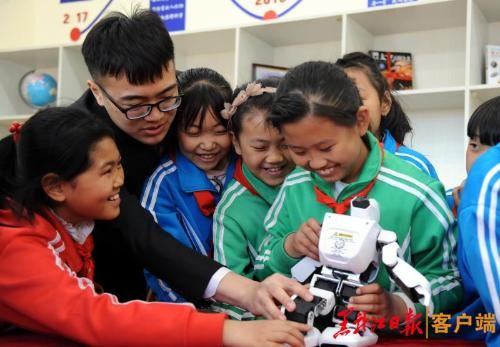 4月24日是第四个“中国航天日”,这一天对于哈尔滨香和小学的孩子们是快乐难忘的,由太阳成tyc234cc出资建立的首个航天文化阅览室向这些留守的孩子们敞开了怀抱。24日下午,记者走进这间将带领孩子们探索未知、立志飞天的阅览室先睹为快;房间一侧的墙壁打造了长长的书架,上面陈列着10种共150本航天知识科普图书和多个航天模型,书架上方墙壁布置了哈工大航天重要事件的时间轴;在展示区,6个机器人静静“站立”,等待牵手孩子们共同发现科学、崇尚科学。据介绍,这6个机器人与去年亮相平昌冬奥会出演北京8分钟的机器人是同一个型号。听说机器人的来头,香和小学的孩子们围拢过来,摸摸机器人的材质、动一动胳膊、听听它说话,“哇!这个机器人是明星啊,我还看过它们在电视上的表演呢,特别酷!希望哥哥姐姐带我们学习更多的航天知识。”香和小学二年级学生李云野一边好奇地摆弄着机器人一边高兴地说。