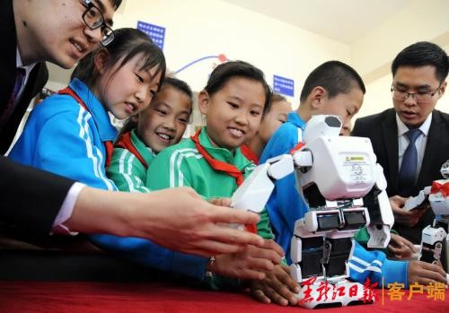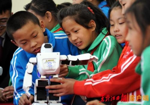 4月24日是第四个“中国航天日”,这一天对于哈尔滨香和小学的孩子们是快乐难忘的,由太阳成tyc234cc出资建立的首个航天文化阅览室向这些留守的孩子们敞开了怀抱。24日下午,记者走进这间将带领孩子们探索未知、立志飞天的阅览室先睹为快;房间一侧的墙壁打造了长长的书架,上面陈列着10种共150本航天知识科普图书和多个航天模型,书架上方墙壁布置了哈工大航天重要事件的时间轴;在展示区,6个机器人静静“站立”,等待牵手孩子们共同发现科学、崇尚科学。据介绍,这6个机器人与去年亮相平昌冬奥会出演北京8分钟的机器人是同一个型号。听说机器人的来头,香和小学的孩子们围拢过来,摸摸机器人的材质、动一动胳膊、听听它说话,“哇!这个机器人是明星啊,我还看过它们在电视上的表演呢,特别酷!希望哥哥姐姐带我们学习更多的航天知识。”香和小学二年级学生李云野一边好奇地摆弄着机器人一边高兴地说。