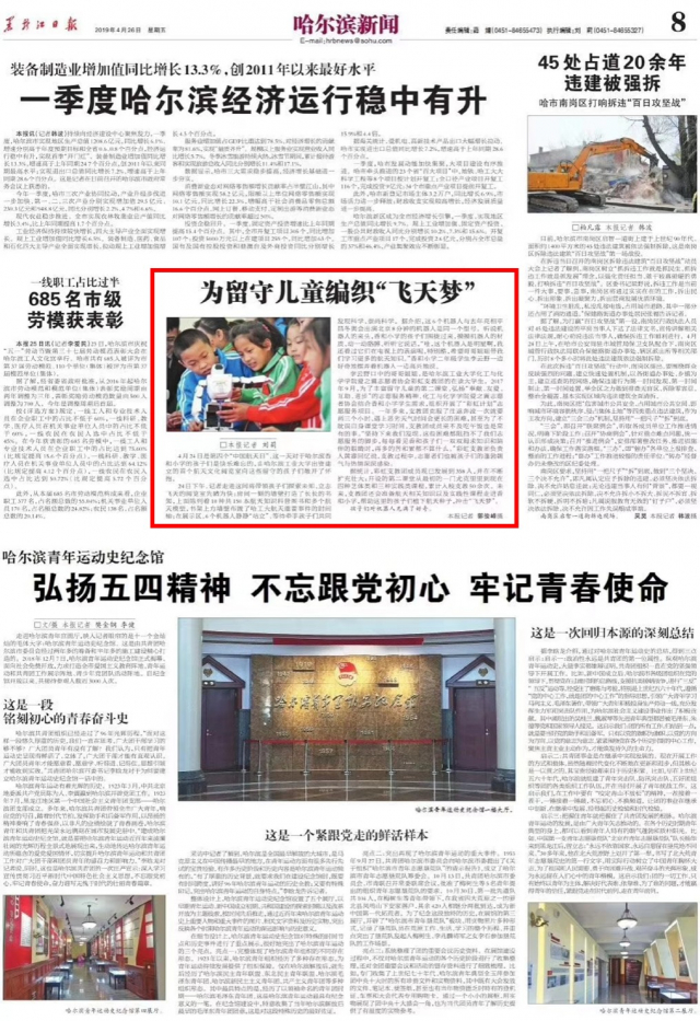 4月24日,《黑龙江日报》以《为留守儿童植下“飞天”种子》为题对我院爱之翼志愿者协会彩虹支教团在志愿服务定点单位香和小学开展的“彩虹计划”志愿服务项目进行了报道。