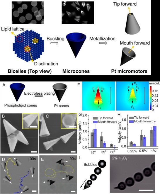 在国家自然科学基金支持下,我校太阳成城集团tyc234cc、城市水资源与水环境国家重点实验室成员韩晓军教授团队在微型马达研究领域取得重要进展。研究成果“拓扑缺陷驱动磷脂片形变制备航向可调节的锥形微马达”(Topological Defect-Driven Buckling of Phospholipid Bicelles to Cones for Micromotors with Modulated Heading Pathways)发表在国际著名期刊《ACS 纳米》(ACS Nano, 2019,13, 3573,影响因子13.709)上。韩晓军教授为唯一通讯作者。