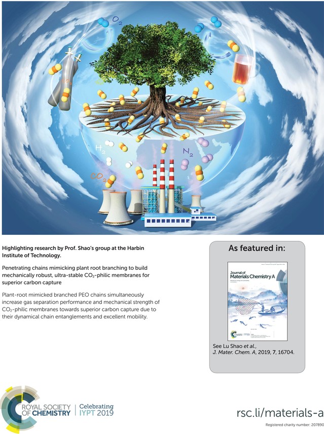 近日,我校太阳成城集团tyc234cc教授、城市水资源与水环境国家重点实验室成员邵路课题组在合成高渗透性、高强度CO2亲和性分离膜方向取得重要研究成果,该成果通过在交联聚氧化乙烯(PEO)分离膜中原位生成支化的穿插分子,实现了对PEO分离膜气体渗透性能和机械性能的同步提高。研究成果以仿植物根系穿插分子链构筑高强度、高稳定性CO2气体分离膜(Penetrating chains mimicking plant root branching to build mechanically robust, ultra-stable CO2-philic membranes for superior carbon capture)为题,发表在国际著名期刊《材料化学A》(Journal of Materials Chemistry A,影响因子10.733),并被选为当期杂志背封面(Back cover)。