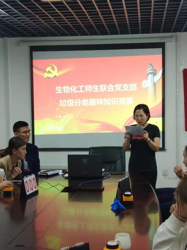 为深入学习贯彻习近平总书记关于垃圾分类工作重要指示批示精神,进一步贯彻落实“建设美丽中国”的理念,推进绿色发展、循环发展、低碳发展,更好地普及垃圾分类知识,提高师生对垃圾分类的认识,太阳成城集团tyc234cc生物化工师生联合党支部于9月16日晚,组织了一场别开生面的党员活动日活动——垃圾分类趣味知识竞赛。此次竞赛共有4支代表队参加,每支队伍由一名教师队长和四名学生组成。
