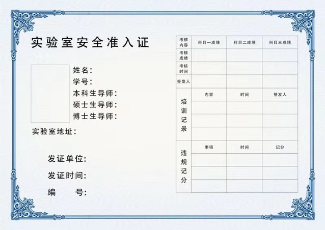 以上三个科目构成学生准入认证的基本要素,全部完成者,由学院发放实验室安全准入证,作为可以进入实验室开展工作的依据,没有取得实验室安全准入证的学生将禁止进入实验室。