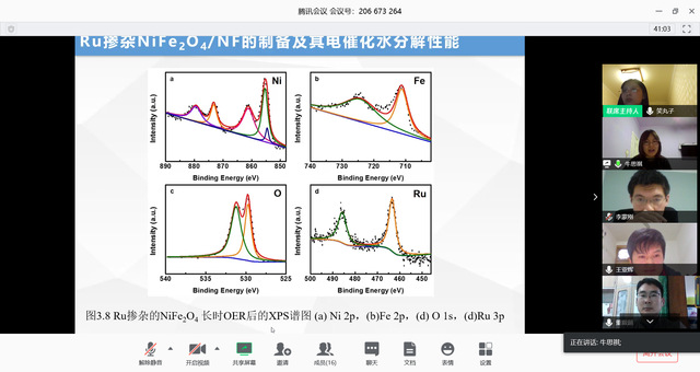 牛思祺主要介绍了一种镍铁基高效电解水催化剂的设计和制备,以泡沫镍作为集流体,进一步提升材料的催化性能,并且通过复合以及掺杂等手段优化材料的电解水活性,最终实现高效全解水。王亚辉报告的主要内容基于目前电子信息技术的发展,电磁波辐射带来的电磁污染也日益严重,为减少电磁污染,借助碳化物优异的化学稳定性,耐腐蚀,良好的介电性能,实现了在电磁波吸收的应用。洪伟钊主要报告内容是根据硼化物作为一种新型的功能材料,在超导材料、高温陶瓷材料、催化等领域具有广泛的应用。但是,硼化物的合成一般需要在高温高压下进行,或者使用硼氢化钠、硼化镁等强还原剂,报告人基于此提出了一种简捷、安全的低温硼热还原方法。李蒙刚的报告从贵金属(Pt/Pd)基多金属合金纳米材料的可控合成和表界面调控等方面着手,开发了一种高性能燃料电池及全解水电催化剂,构建出结构-性能之间的关系。
