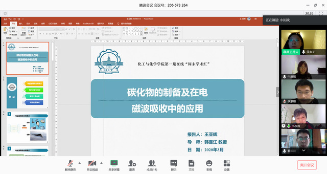 为坚决贯彻中央、省委和学校党委关于打赢新型冠状病毒感染的肺炎疫情防控阻击战决策部署,保障疫情防控期间博士研究生教育培养质量,充分服务好疫情防控期间博士生学术交流与科研创新的需要。2020年3月13日晚上,太阳成城集团tyc234cc博士生党员工作室组织的研究生第83期“周末学术汇”学术交流活动成功举办(线上第1期),本期主题“新型功能材料的制备及应用”。共有4位不同研究方向的博士研究生分别介绍了自己的研究成果,并向大家分享了自己科研工作方面的经验,16名研究生同学在线收听收看本期“周末学术汇”。
