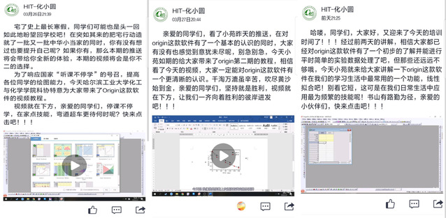 为响应国家“停课不停学”号召,同时为学院本科生增添实用软件使用技能,助力毕业年级学生实验数据处理相关工作,提高学生综合素质。学院科技创新者协会于2020年3月3日至3月16日进行了origin软件常用功能的视频教程录制工作,并于3月24日至3月28日通过学院官方QQ平台线上推送三期,视频累计浏览量近千次。