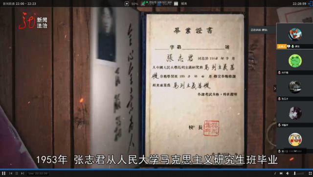该专题片反映了哈尔滨师范大学马克思主义学院教授张志君的先进事迹,叙述了他加入中国共产党、参加工作、退休后仍然心系教育事业的经历。张志君教授1953年从中国人民大学第一期马列主义研究生班毕业后,回到东北师范大学从事马列主义基础教学工作。1956年,他响应“支援龙江”的号召,来到哈师院(1980年改为哈尔滨师范大学)从事科学社会主义教学工作,把一生奉献给了这片热土。大家观看完专题片后,感慨良多,对张志君教授的事迹和精神有了深刻的理解。在这个特殊时期进行集体学习,有利于帮助大家调整心态,正确对待疫情,树立积极向上的奋斗精神,使大家认识到青春之宝贵,努力拼搏,不懈奋斗,把自己的绵薄之力奉献给祖国的建设。