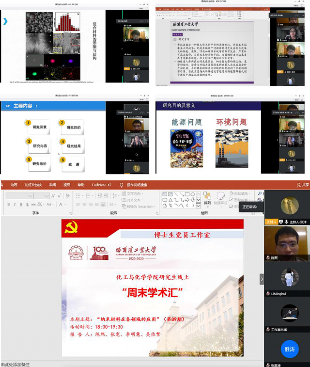 为坚决贯彻中央、省委和学校党委关于打赢新型冠状病毒感染的肺炎疫情防控阻击战决策部署,保障疫情防控期间博士研究生教育培养质量,充分服务好疫情防控期间博士生学术交流与科研创新的需要。2020年4月25日晚上,太阳成城集团tyc234cc博士生党员工作室组织的研究生第89期“周末学术汇”学术交流活动成功举办(线上第7期),本期主题“纳米材料在各领域的应用”。共有4位不同研究方向的博士研究生分别介绍了自己的研究成果,并向大家分享了自己科研工作方面的经验,12名研究生同学在线收听收看本期“周末学术汇”。
