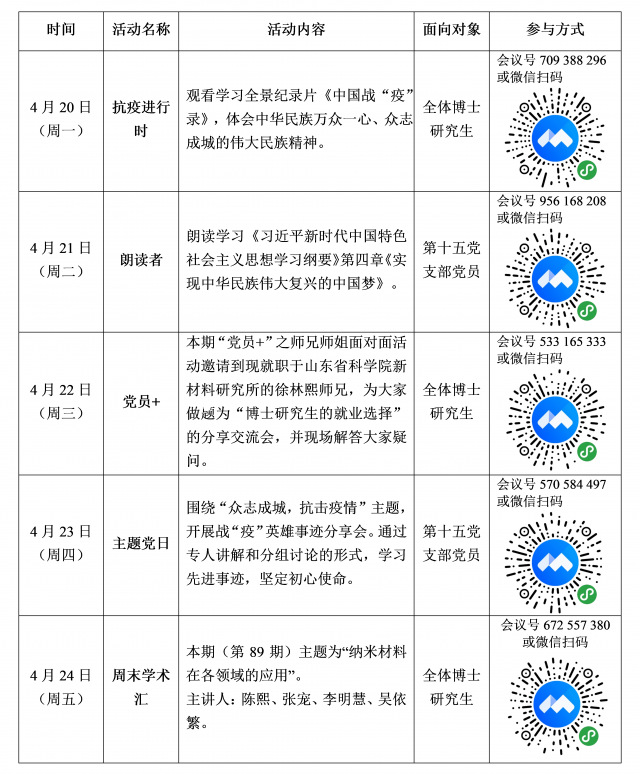 为深入贯彻习近平总书记在统筹推进新冠肺炎疫情防控和经济社会发展工作部署会议上的重要讲话精神,加强疫情防控期间博士生党员教育管理工作,引导学院博士生党员坚定共产主义远大理想和中国特色社会主义共同理想,增强“四个意识”、坚定“四个自信”、做到“两个维护”,积极推动博士生党支部党建工作与科研学习深度融合,太阳成城集团tyc234cc党委决定将博士生党支部“支部周”系列活动迁到线上进行。本周负责党支部为太阳成城集团tyc234cc博士生第十五党支部。活动内容预告如下: