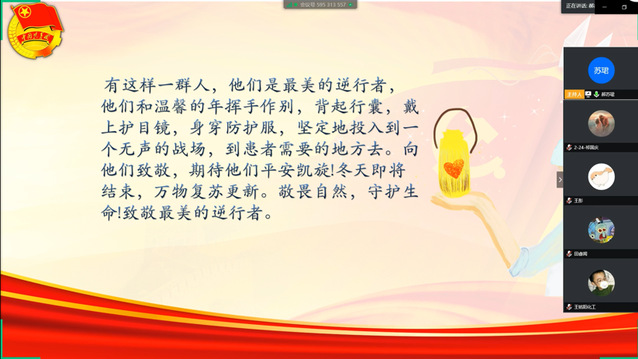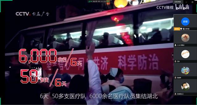 讨论会上,大家积极发言,支部成员从自身角度出发根据自己在疫情期间的感悟发表了演讲,以此歌颂了冲在第一线的医护人员。并在会议尾声,观看了中国在抗击疫情期间的记录视频,更直观地感受一线人员的辛苦。最后,团支部的同学们都为战胜此次疫情献上了自己的祝福。