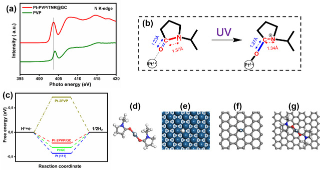 单原子催化剂(SACs)因其极高的原子利用效率和无与伦比的卓越催化性能,近年来在多相催化领域越来越受到广泛关注,尤其在贵金属单原子催化剂领域,其突出的催化活性可以弥补它们在稀有量和高成本的短板,从而实现大规模商业化应用。目前,原子级分布的铂原子已经成功地锚定在各种载体材料上,在各种催化反应中表现出了优越的催化性能。SACs中金属原子与周围配位环境的相互作用一直被认为是调节单位点催化活性的一个重要参数,但是,这一问题在很大程度上仍然是未知的,通常也没有很好的研究方法,特别是对于通过热解方法制备的SACs。在本工作中,团队采用了一种常温下可控的光化学方法制备Pt SACs。该策略实现了利用有机稳定剂聚乙烯吡咯烷酮(PVP)调控单原子Pt的电子结构,研究发现用含有酰胺基N-C=O基团的不仅是维持Pt原子分布的配位环境,而且对Pt SACs电子结构产生供电子效应。理论计算(DFT)和同步辐射光谱数据(N K-edge XANES spectra)均表明:带部分正电荷的Pt原子与PVP分子的酰胺基团(N-C=O)配位结构是电解水制氢反应(HER)的活性中心。在电化学性能测试中,制备的Pt SACs催化剂呈现出优秀的HER活性和稳定性。该方法开拓了一个普适性兼高价值的研究视角:通过精心挑选出基于电子结构的配位结构的贵金属和配位基团来设计贵金属(如Au, Pd, Ru, Ag等)单原子催化剂,以此来提升各种化学反应的催化性能。